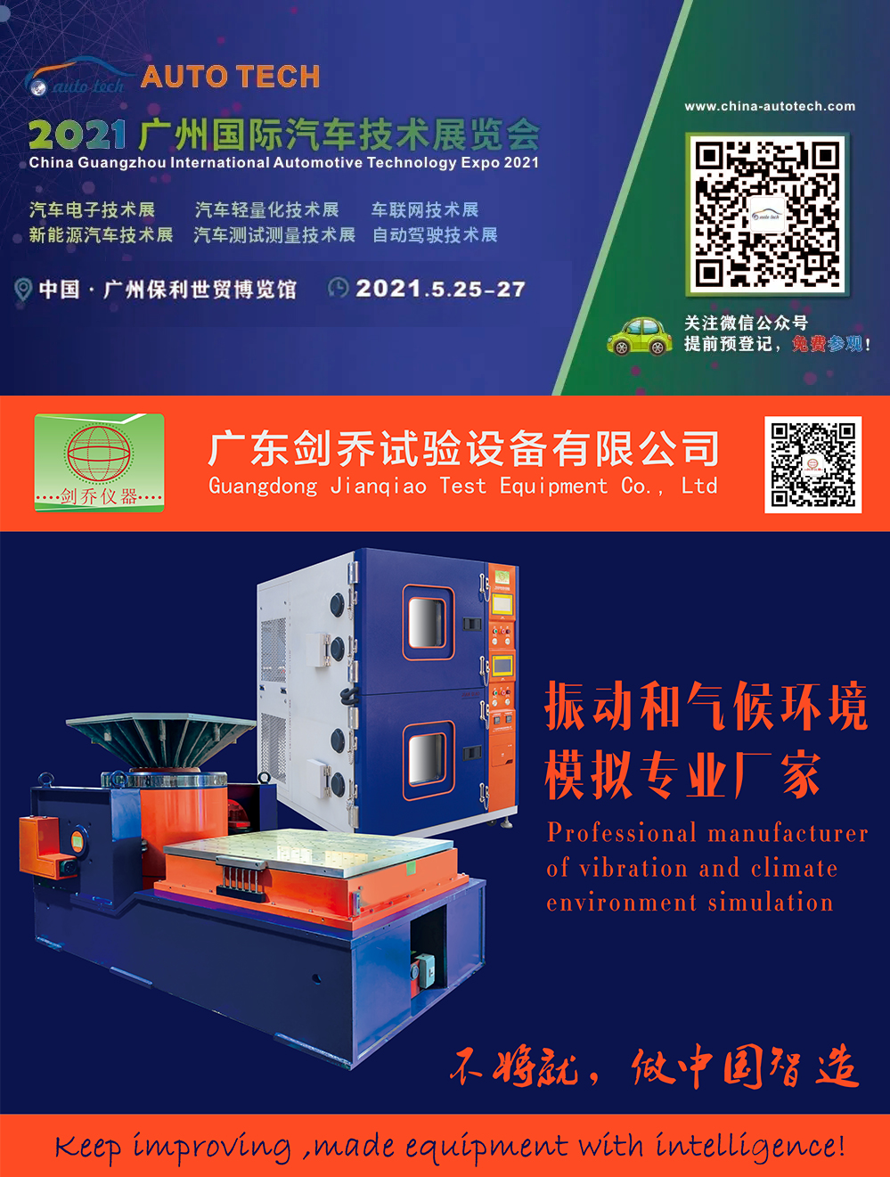 2021年5月25-27日,廣東劍喬試驗(yàn)設(shè)備有限公司【劍喬儀器】將攜旗下最新試驗(yàn)設(shè)備亮相AUTO TECH 2021 中國(guó)·廣州第八屆國(guó)際汽車技術(shù)展覽會(huì),現(xiàn)場(chǎng)展示:振動(dòng)試驗(yàn)系統(tǒng)、溫濕度振動(dòng)三綜合箱、高低溫防爆試驗(yàn)箱高加速?zèng)_擊試驗(yàn)臺(tái)、電池?zé)釣E用試驗(yàn)機(jī)、電池短路試驗(yàn)箱、等試驗(yàn)設(shè)備及動(dòng)力電池相關(guān)試驗(yàn)解決方案。